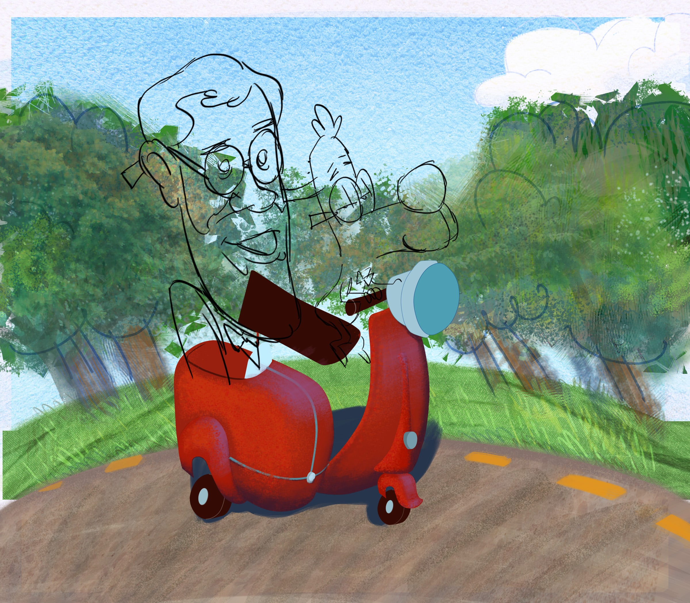 I isolated the scooter into clean shapes to keep the geometrical design sharp. Shadows, bounce, and highlights were added.
