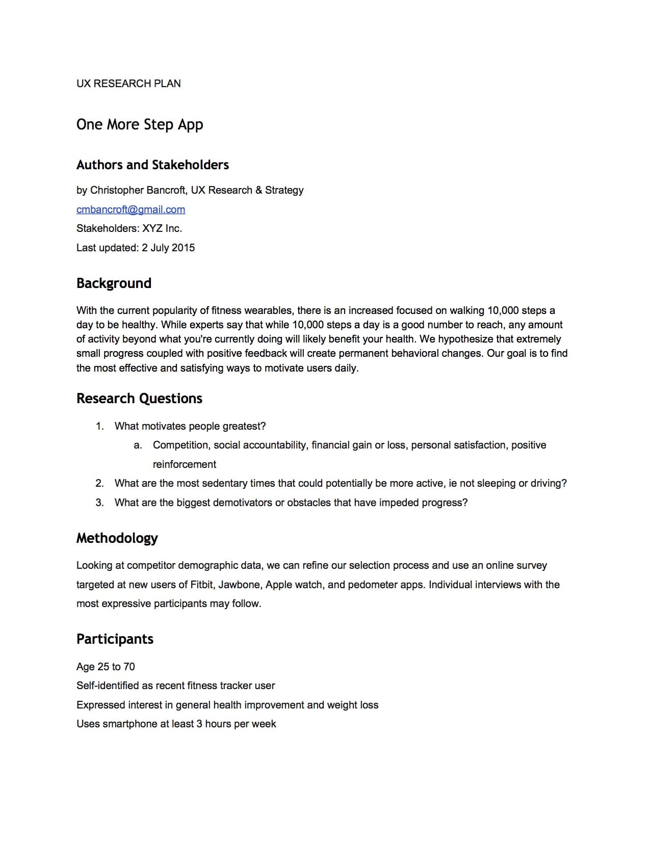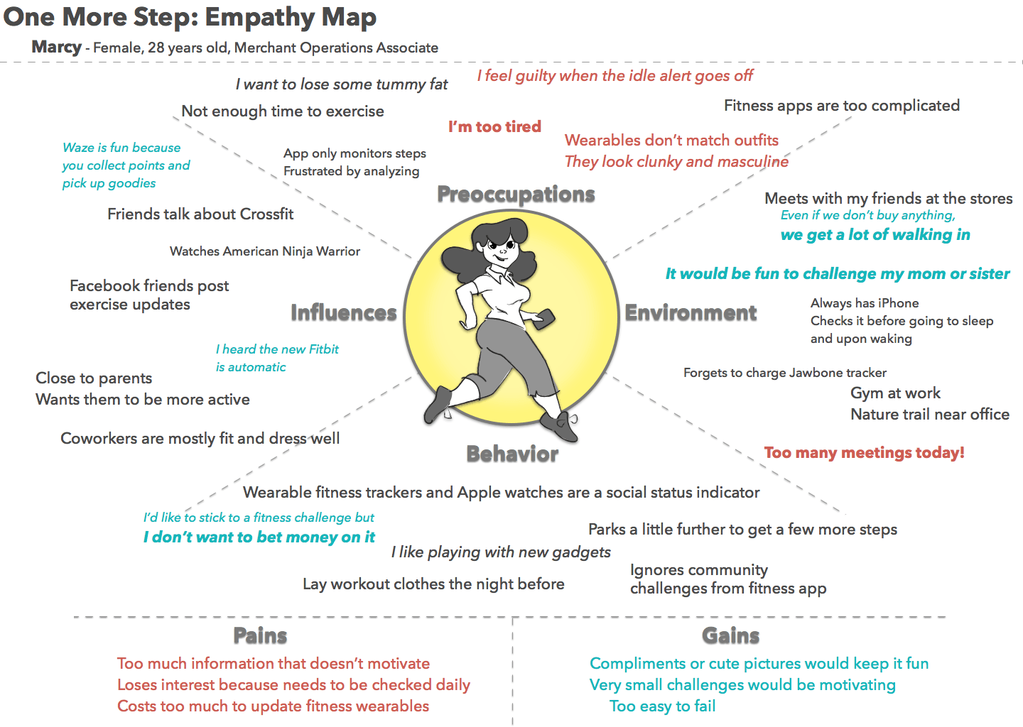 I conducted interviews of new users of Fitbit, Jawbone, and pedometer apps. Some of the questions I looked to answer were: